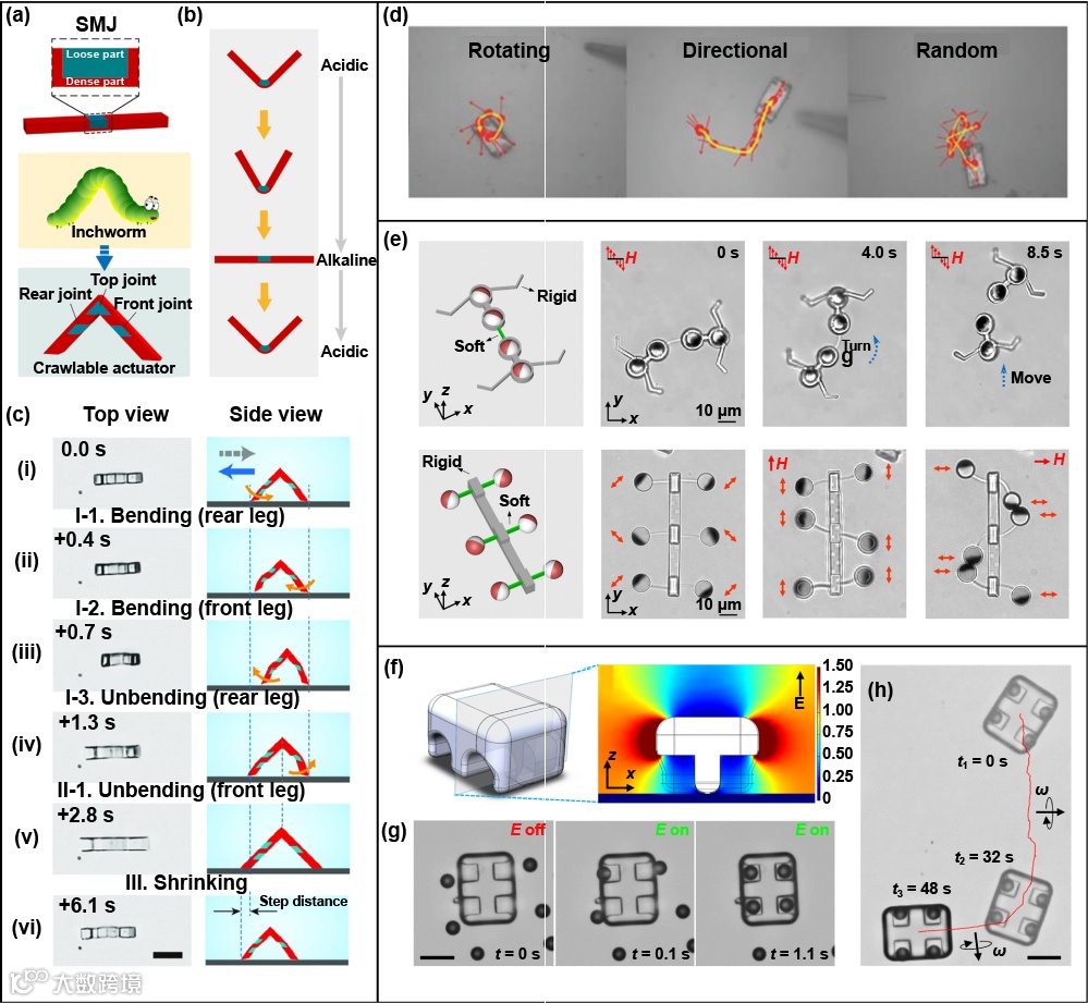 图5 基于双光子聚合的4D打印自主移动微型机器人:(a-c) 仿尺蠖爬行执行器的设计,响应刺激变形和爬行运动。经许可转载,版权所有 (2020) Wiley-VCH Verlag GmbH;(d) 光燃料微型步行者的运动行为。经许可转载,版权所有 (2015) Wiley-VCH Verlag GmbH;(e) 受蜥蜴启发的具有刚性腿的行走微型机器人的表面运动。经许可转载,版权所有 (2021) American Chemical Society;(f-h) 微型车辆响应垂直旋转磁场而发生平移。经许可转载,版权所有 (2019) Springer Nature。