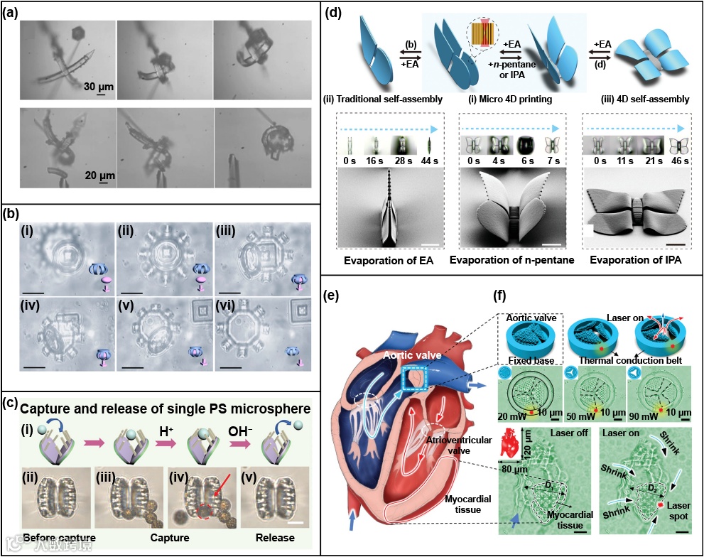 图4 基于双光子聚合的4D打印仿生微执行器:(a) 微型抓手通过激光激活顺序夹持聚合物微块,经许可转载,版权所有 (2017) Wiley-VCH Verlag GmbH;(b) 通过控制微爪来收集和释放目标微球,经许可转载,版权所有 (2019) American Chemical Society;(c) 仿捕蝇草的微执行器捕获和释放微球,经许可转载,版权所有 (2022) Wiley-VCH Verlag GmbH;(d) 受控微型蝴蝶翅膀自组装,经许可转载,版权所有 (2021) Wiley-VCH Verlag GmbH;(e) 仿生主动脉瓣微结构,经许可转载,版权所有 (2023) Wiley-VCH Verlag GmbH。