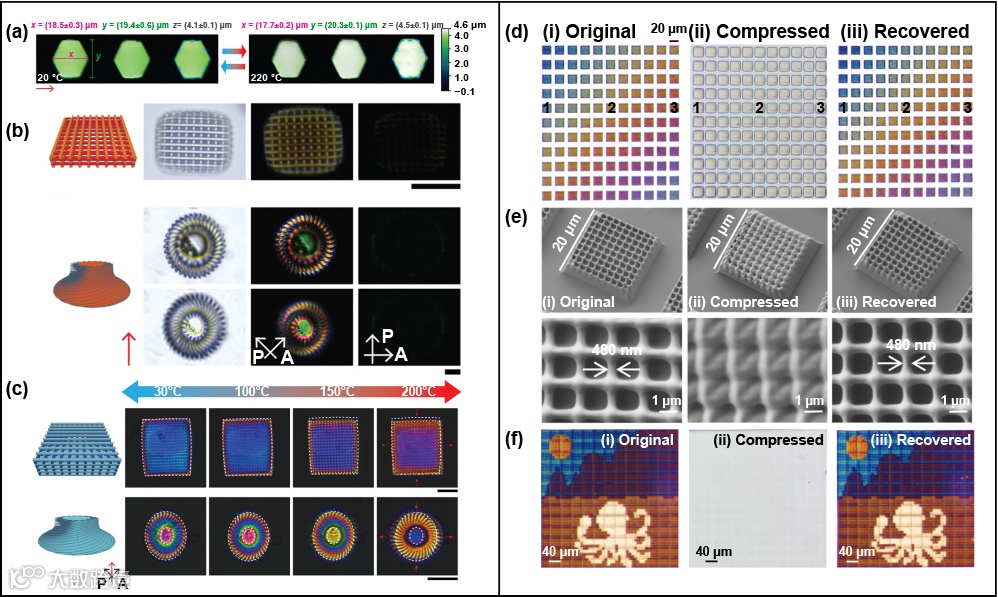 图7 基于双光子聚合的4D打印防伪微器件:(a-c) 木桩和螺旋盘微结构的温度响应和偏振光学显微照片。经许可转载,版权所有 (2021) Wiley-VCH Verlag GmbH;(d-f) 打印的调色板在打印、压缩和恢复状态下的不同颜色。经许可转载,版权所有 (2021) Springer Nature。