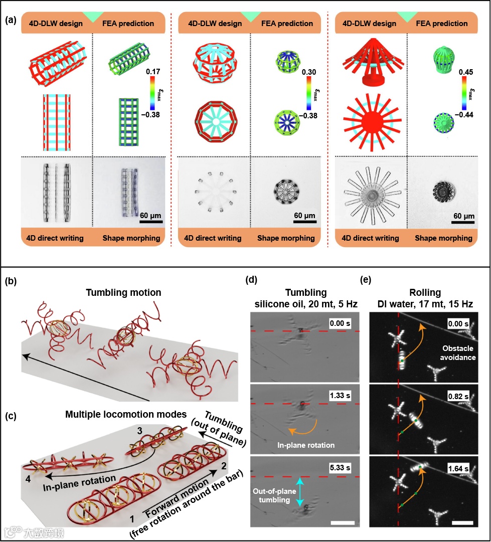 图6 基于双光子聚合的4D打印可变形设备和机器人:(a) 三维可重构微结构(微支架、微笼和微伞)的可控变形。经许可转载,版权所有 (2020) Elsevier Ltd;(b-e) 笼-杆-环结构的面内旋转和面外翻滚运动。经许可转载,版权所有 (2020) Springer Nature。