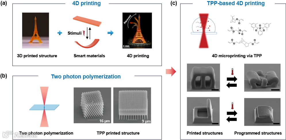 介绍了双光子聚合的工作原理和最新进展及其可选用的4D打印材料;