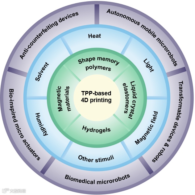 总结了基于双光子聚合的4D打印技术在微纳米尺度的重要应用;