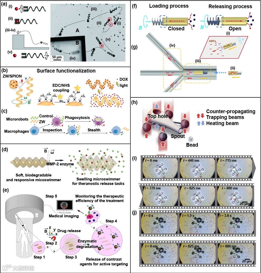 图3 用于生物医疗应用的基于双光子聚合的4D打印微型机器:(a-e) 磁性螺旋微型游泳器。经许可转载,版权所有 (2012) Wiley-VCH Verlag GmbH, (2020) Wiley-VCH Verlag GmbH, (2019) American Chemical Society。(f-g) 阿基米德螺杆泵送机构加载和释放机制。经许可转载,版权所有 (2015) Wiley-VCH Verlag GmbH。(h-j) 光触发微型工具的结构和光学操作。经许可转载,版权所有 (2016) Springer Nature。