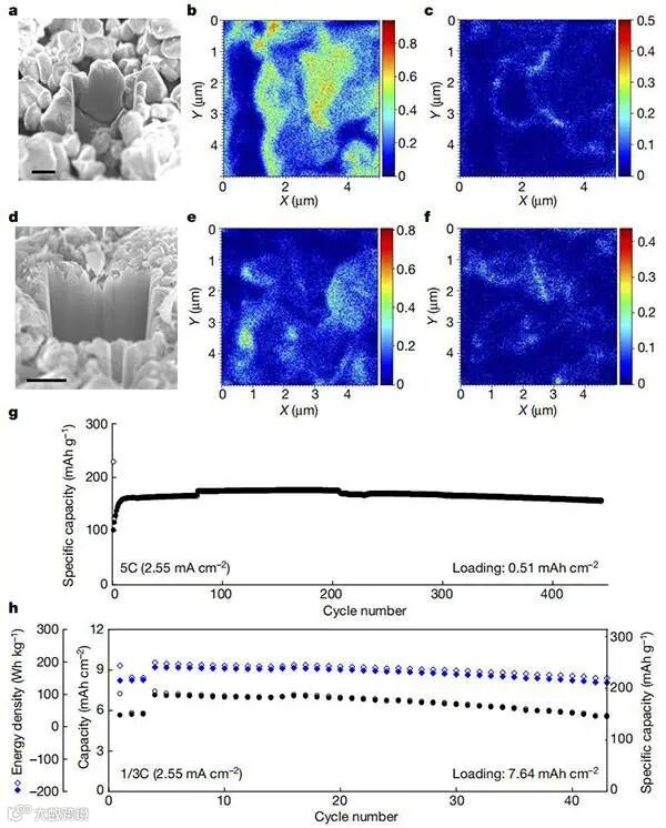 在正极侧,作者使用一种富氟(F)的界面层,其中F阴离子能够在4.3V时从NMC811表面层迁移到NMC811体相中,从而使得表明涂覆转化为F掺杂,最终使得NMC811从表面到体相的材料稳定性得到大幅度提高,即使在2.5 MPa的低堆叠压力下也能实现极其优异的性能。