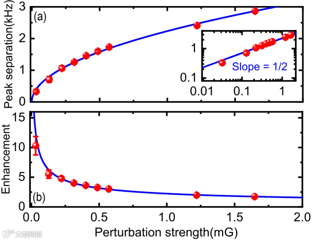 受限于系统的耗散,很小的简并能级的劈裂往往不能够被探测到。与通常利用光的透过率或者反射率来确定能级劈裂的方法不同,该工作利用热原子系综的光学偏振旋转信号来检测能级的劈裂。光学偏振旋转信号不仅包含了光的吸收信息,也包含了光的色散信息,因此对能级的劈裂更加敏感。在实验上,对于相同的微扰,光学偏振旋转谱的劈裂也表现出比吸收谱更大的劈裂信号,表明这种确定能级劈裂的方法更加有效。如图2(a)所示,光学偏振旋转谱的劈裂正比于微扰强度的平方根,并且相比较于相同参数的厄米简并情况,有一个数量级的提升[图2(b)]。