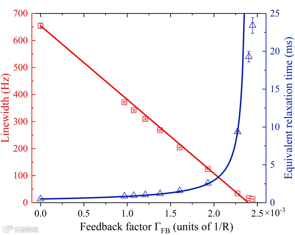 图5 线宽和等效弛豫时间随反馈系数变化的实验结果。