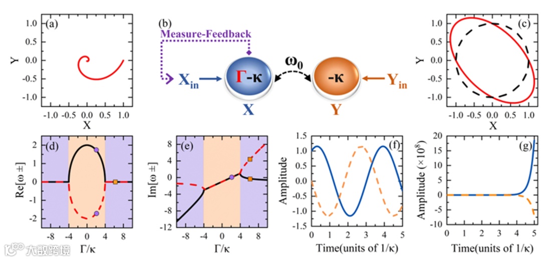 图3 PT对称型反馈原理图。(a)典型耗散谐振系统相图。(b)PT对称型反馈系统示意图。(c) 相图对比,PT对称系统(红色实线),无耗散的厄米谐振系统(黑色虚线)。(d)-(e):本征值实部和虚部随反馈系数的变化。(f)-(g):在PT对称和破缺区间,正交分量的时间演化。