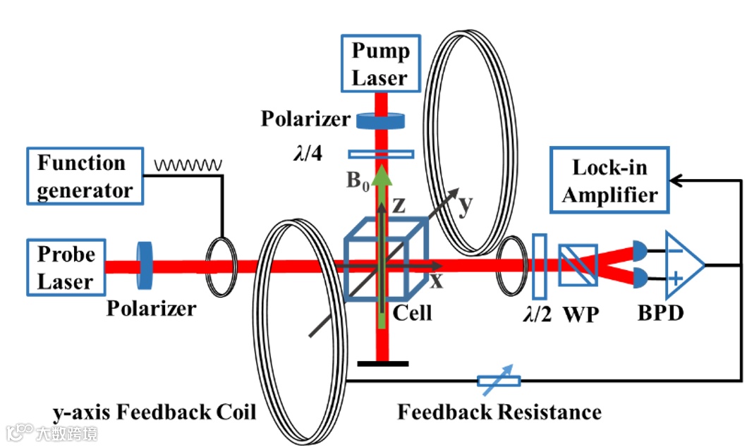 该工作在热原子系综中演示了PT对称型反馈方案。使用圆偏振光泵浦方法将原子系综的自旋极化,极化自旋矢量绕z方向磁场做拉莫尔进动,xy平面上的自旋分量(Px、Py)构成了有耗散的谐振模式。通过探测光穿过极化原子系综的顺磁法拉第旋光效应,实现对正交分量Px的测量。将测量得到的信息加载到反馈磁场线圈,产生的反馈磁场作用到原子系综,效果是在Px正交分量引入了增益,打破了Px、Py两个正交分量的对称性,使得集体自旋振子成为了PT对称系统。