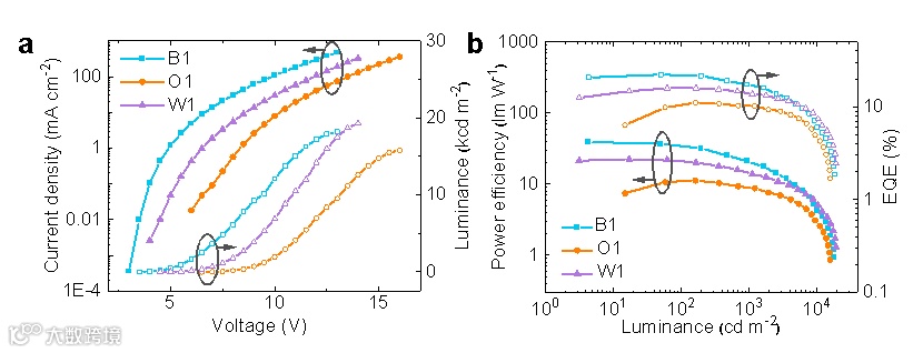 通过主体材料的筛选,9,9'-(1,3-苯基)二-9H-咔唑(mCP)被选定为Ce-TBO2Et和Eu(Tp2Et)2的主体材料。基于相同的器件结构(仅发光层不同),本文制备了天蓝光器件B1和橙红光器件O1,发光层分别为mCP:Ce-TBO2Et(10 wt%)和mCP:Eu(Tp2Et)2(12 wt%),器件的最大外量子效率(EQE)分别为22.3%和11.1%,是目前性能最好的基于d-f跃迁稀土发光配合物的蓝光和红光OLEDs。