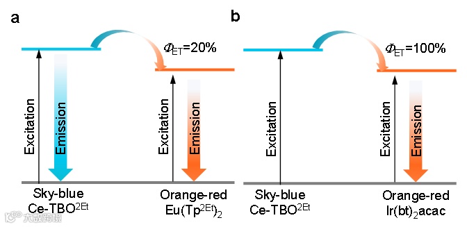 减少能量传递通道是简化器件的设计和制备过程的一种新策略。d-f跃迁稀土发光配合物作为发光材料应用于有机发光二极管(OLEDs)时,主体材料基本不参与能量传递过程。除此之外,这类发光材料应用于OLEDs时还具有诸多优势,如理论效率高,激发态寿命短,发光颜色可调和成本低等。所以,d-f跃迁稀土发光配合物在SEL-WOLEDs中的应用潜力非常值得探索。