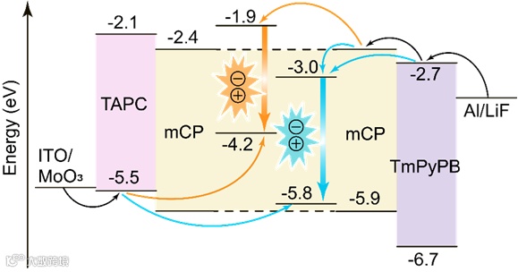 典型的SEL-WOLEDs的发光涉及到发光层中主体材料与发光材料的传能以及发光材料与发光材料的传能,复杂的传能过程的调控增大了器件设计的难度。不仅如此,发光能量较低的材料往往需要以极低的浓度(<1%)掺杂在发光层中,这也增大了器件制备的难度。