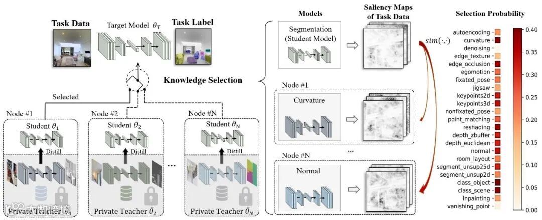 为此,研究团队探索了一种新的知识重组问题,名为联邦知识重组,其中若干预训练模型和训练数据分布在不同的服务器节点上,它们不被公开,只能在本地进行训练。为了解决这个问题,本文提出一种基于选择性知识聚合的联邦知识重组方法(如图1),该方法能够自动化地选择合适的预训练模型,然后利用代理模型间接地学习选择的知识,并将其聚合到目标任务的模型中,以此达到定制目标模型的效果。具体而言,本文首先提出了一种基于显著图的模型选择策略,并通过代理模型在服务器节点之间传输知识,最后上传到中心节点实现进一步的知识聚合, 如图2。