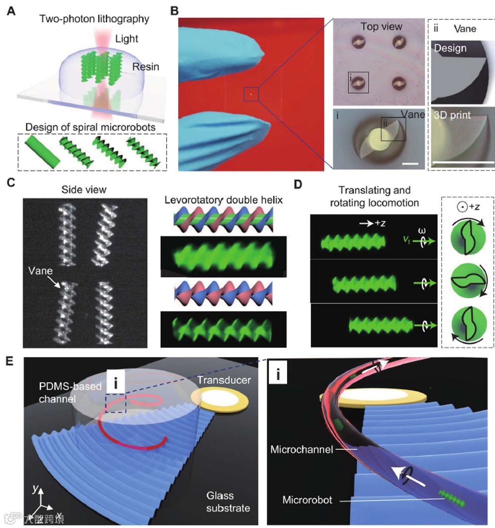 近日,瑞士苏黎世联邦理工学院Daniel Ahmed团队,受螺旋体细菌的螺旋几何形状的启发,提出了一种声学驱动的螺旋微型机器人(或微型螺旋桨),它能够使用鳍状的双螺旋叶片进行运动。不对称的双螺旋形状用于与入射声场相互作用,产生推进力矩,使微型机器人绕其长轴旋转。此外,该微型机器人具有独特的推进方向,只需调节声频即可切换。作者使用单一声源在人工任意形状的2D和3D血管中演示了这种运动。由于超声波已经在临床环境中作为一种成像手段被广泛使用,该机器人系统可以无缝地集成到当前系统中。因此,该工作将对开发用于非侵入性外科手术的下一代智能微型机器人做出重大贡献。(刘帅)相关工作发表在《Science Advances》上。