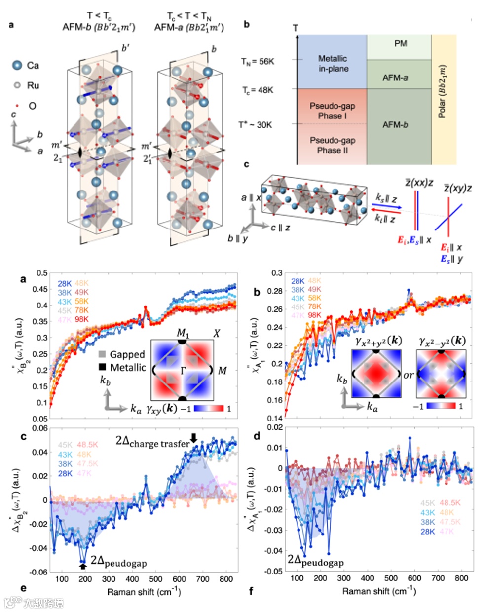 近日,美国宾夕法尼亚大学的Venkatraman Gopalanyan教授团队证明,尽管材料在基态下似乎不体现出DFT预测的电荷密度波,但在Ca3Ru2O7中,特定模式的红外光学声子可以诱导出上述密度波。这篇工作首先通过Ca3Ru2O7材料的变温拉曼谱发现了两个主要的B2模式声子,标记为B2P和B2M,它们分别与电子基态和磁基态强耦合。考虑自旋-轨道耦合的第一性原理冻结声子法计算表明,B2P声子模式打开赝隙,而B2M模式关闭赝隙。其次,该工作对背景电子拉曼散射的对称性进行了仔细的分析,发现在48K以下,电子拉曼散射在550cm-1以上的B2谱中表现出明显的上升,而在A1谱中却没有,表现出对称性依赖的谱权重转移,揭示了红外模式B2声子诱导的电荷和自旋密度波。以上发现加深了人们对电子-声子耦合在调制强关联材料赝隙中的作用的理解,并为钌酸盐中电子相的声子调控提供了有力的理论与实验支撑。相关工作以“Strong electron-phonon coupling driven pseudogap modulation and density-wave fluctuations in a correlated polar metal”为题发表在《Nature Communications》上。(侯玥盈)