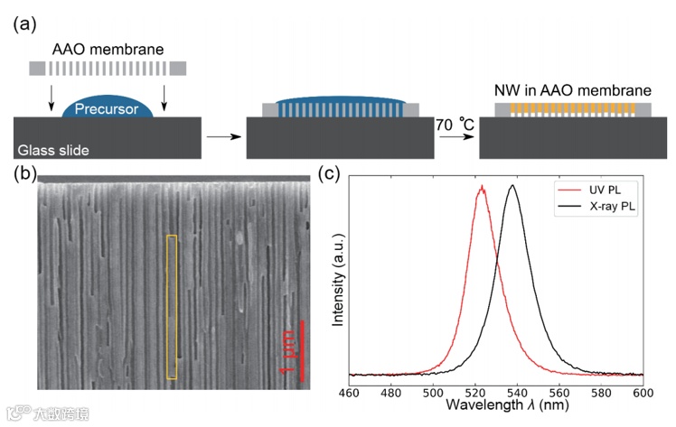X射线显微镜已成为医学、材料科学、古生物学、文化遗产、质量控制等各个研究和技术领域的标准非侵入性技术。断层扫描通过获取大量的图像,通常是1000个投影,在稍微不同的角度,使3D显微镜成为可能。同步加速器x射线源的亮度和相干性不断提高,使得x射线显微镜和断层扫描能够达到纳米尺度,而实验室系统通常提供微米级和亚微米级的分辨率。因此,对具有更高分辨率、效率、稳定性、制造成本、噪音和灵敏度的新型探测器材料的需求比以往任何时候都高。近期,瑞典隆德大学 Hanna Dierks 和 Zhaojun Zhang 研究团队证明了在阳极氧化铝 (CsPbBr3 NW/AAO)中生长的CsPbBr(MHP)闪烁体纳米线(直径为 60 nm,长度为 5~9 μm)在 X 射线显微断层扫描中具有足够的稳定性,表明 CsPbBr3 NW/AAO 闪烁器有望成为高分辨率 X 射线成像探测器。