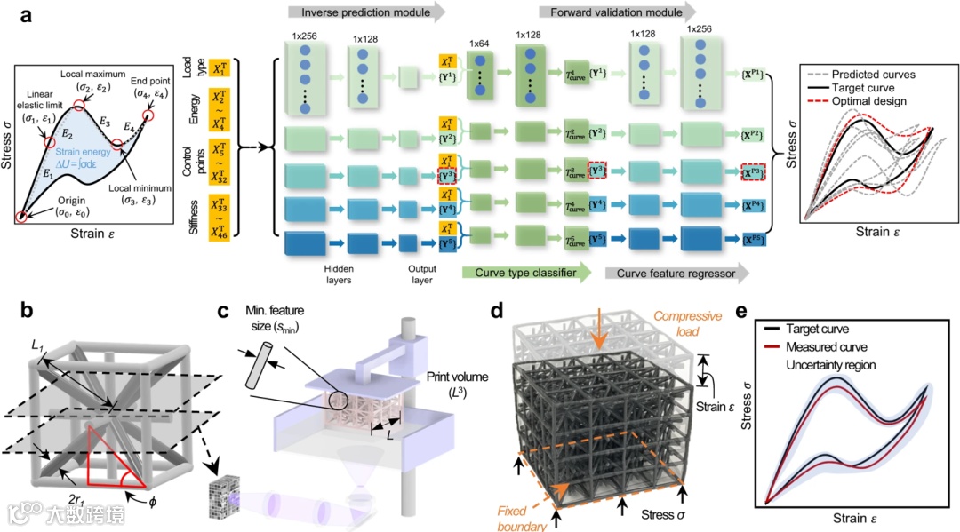 近日,美国弗吉尼亚理工大学的郑小雨研究团队,与美国加利福尼亚大学、美国俄克拉荷马州立大学、四川大学和英国剑桥大学的研究人员,提出了一种力学超材料的快速逆向设计方法,该方法利用生成式机器学习和桌面增材制造技术,在考虑打印过程中的误差的情况下,创建几乎所有可能的单轴压缩应力-应变曲线。结果显示,该方法可以实现材料力学性能的完全可定制,且预估目标与实验测量结果之间的一致性接近90%。该方法代表了逆向设计材料满足复杂力学性能目标可定制的起点,该方法可能可以绕过迭代的设计-制造周期,通过简化设计制造周期,对防护服、汽车和飞机零部件、吸能材料和智能材料的未来发展具有直接意义。相关工作以“Rapid inverse design of metamaterials based on prescribed mechanical behavior through machine learning”为题发表在《Nature Communications》上。(孙嘉鹏)