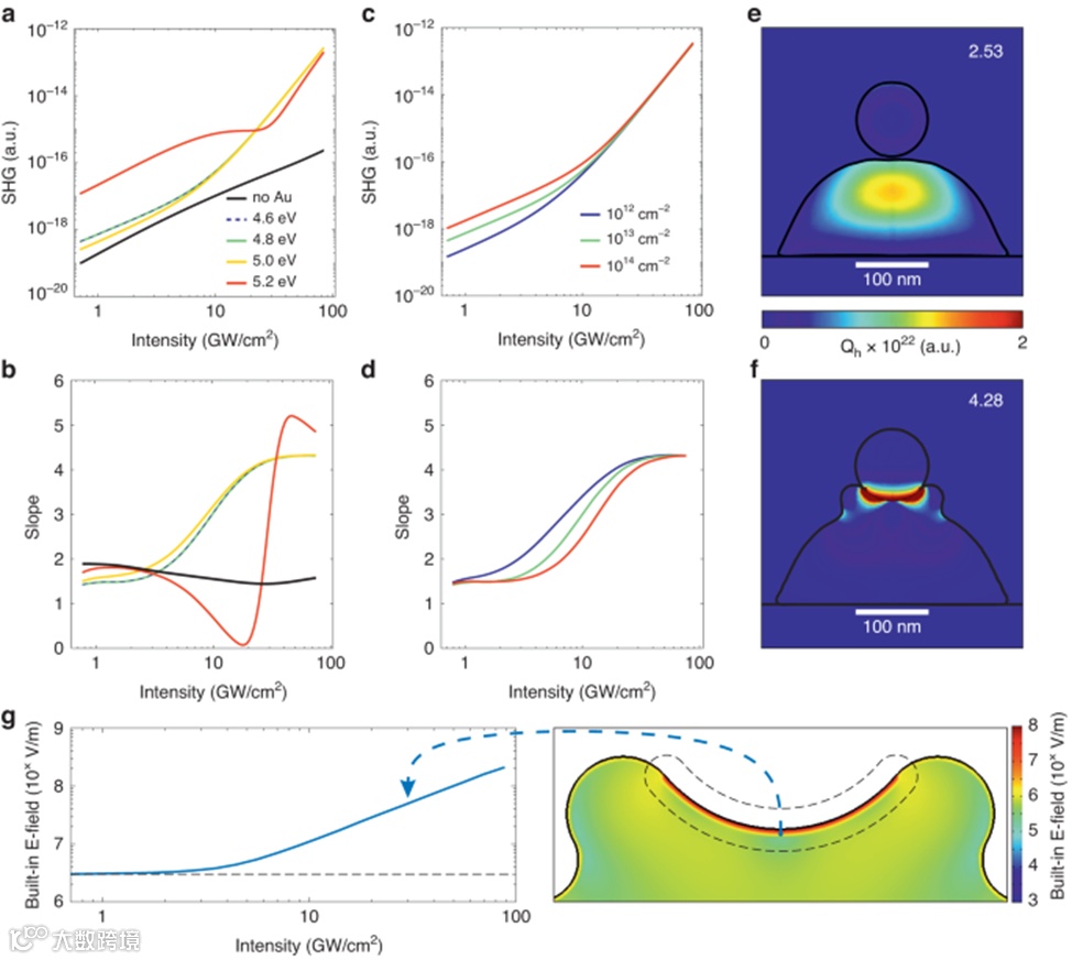 图3. EFISH 的模拟结果。(a) 不同金属功函数下的SHG信号与(b) 相对应的信号/激发强度的依赖性;(c) 不同表面态密度下的SHG信号与(d) 相对应的信号/激发强度的依赖性;(e) 和(f) 金属-半导体界面对应的吸收能量和相对应的信号/激发强度的依赖性; (g) 感应电场的强度。
