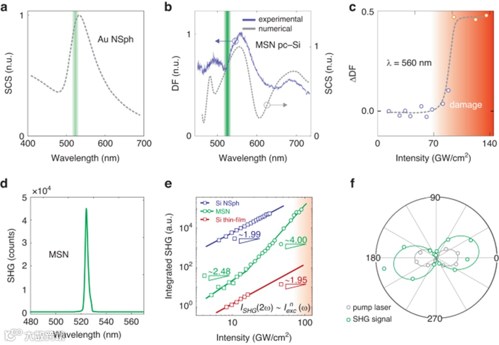 图2. 用于 探测EFISH 的金属-半导体纳米结构的设计。(a) 金纳米球的散射谱;(b) 实验和仿真的MSN散射图;(c) 利用散射谱监控SHG测量过程中的形态变化;(d) SHG信号;(e) MSN、Si球、Si膜的SHG信号/激发功率依赖性; (f) MSN的SHG信号与激光辐射图。
