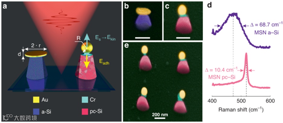 图1. 飞秒激光加工金-硅纳米天线。(a) 金外形改变;(b) 和(c) 加工前后的扫描电镜图;(d) 加工前后的硅结构拉曼光谱,紫色为非晶硅,粉色为多晶硅;(e) 加工阵列