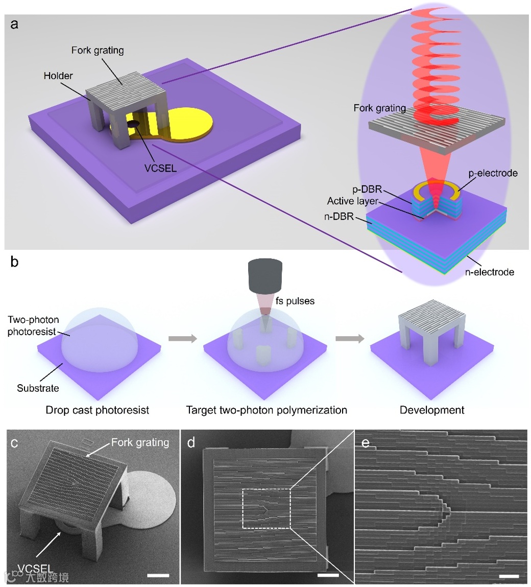 图1 垂直腔面发射涡旋光激光器。(a)原理示意图。(b)激光3D打印示意图。(c-e)器件扫面电子显微镜图。