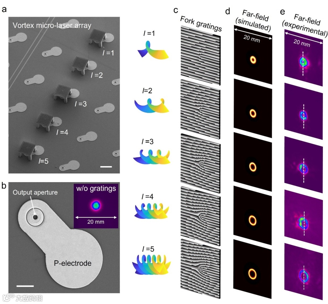 图2 垂直腔面发射涡旋光激光器阵列。(a)阵列扫描电子显微镜图。(b)未打印OAM相位结构的VCSEL器件的扫描电子显微镜图。(c)叉形光栅相位图。(d)模拟的激光器远场。(e)实验获得的激光器远场。