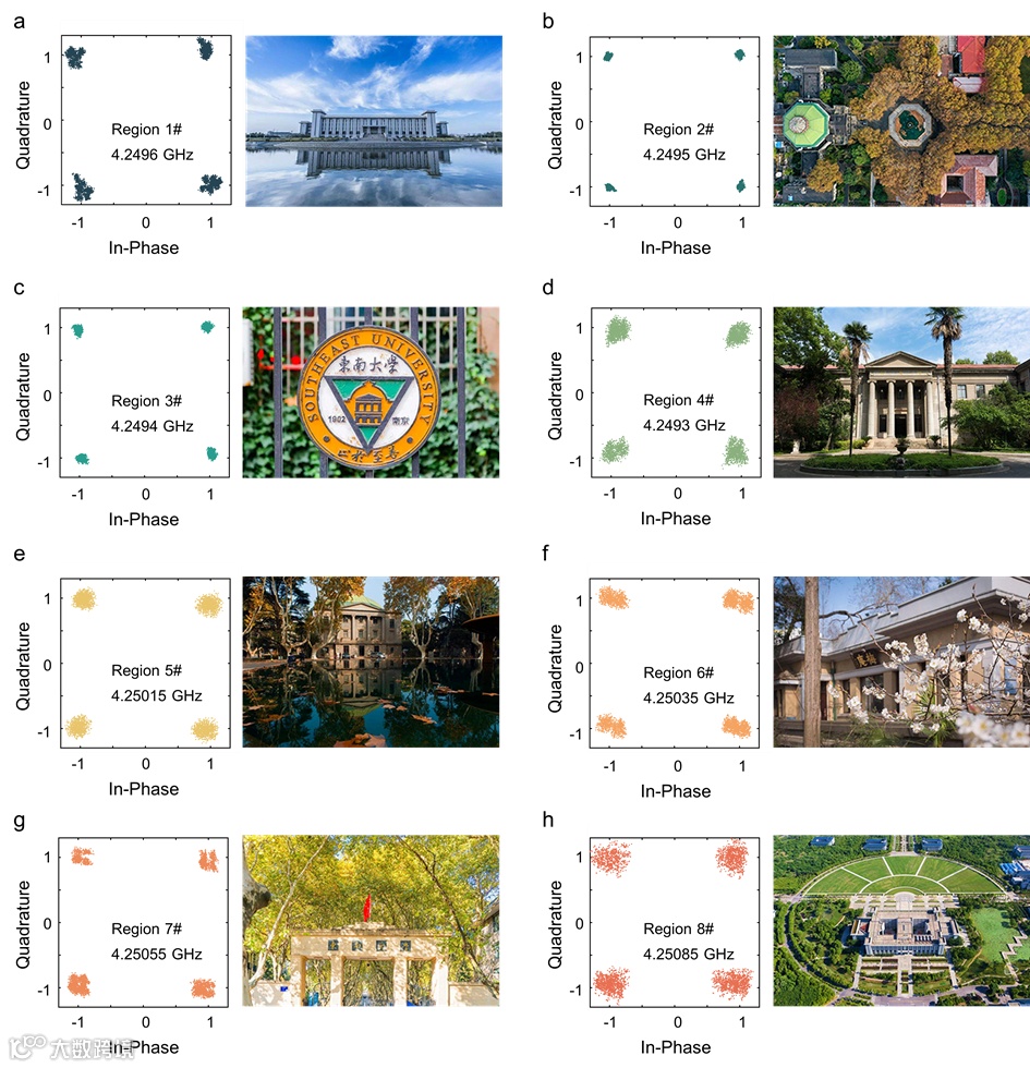 图2. 基于异步时空编码超表面的无线通信发射机,用于构建频分复用无线通信系统。(a-h)八个工作频点下的星座图及恢复的图片