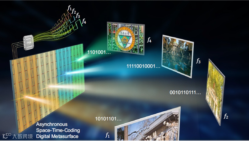 图1. 基于分区式异步时空编码超表面实现多频电磁波和信号联合调控概念图