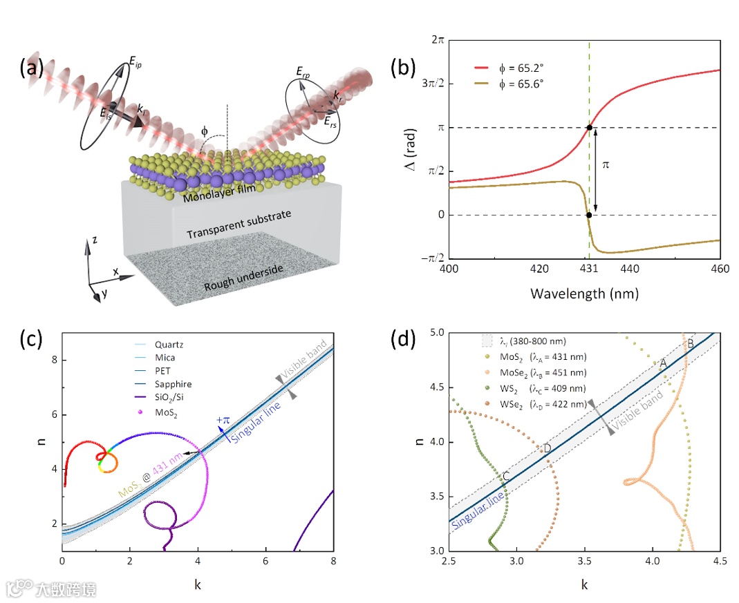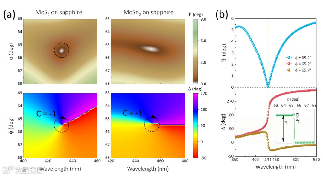 (相位差) 测定PS,图2(a) 显示了在接近PS的入射角和波长条件下,蓝宝石衬底上单层MoS2与MoSe2的