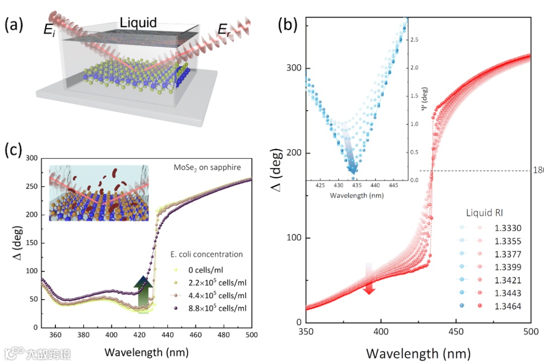 图3 单层TMDC的PS构建无标记生物传感器 (a)生物传感测量装置示意图。(b)在微变折射率的溶液中测量单层MoS2的椭偏参数响应特征。(c) 在不同浓度的大肠杆菌溶液中单层MoSe2的相位响应。