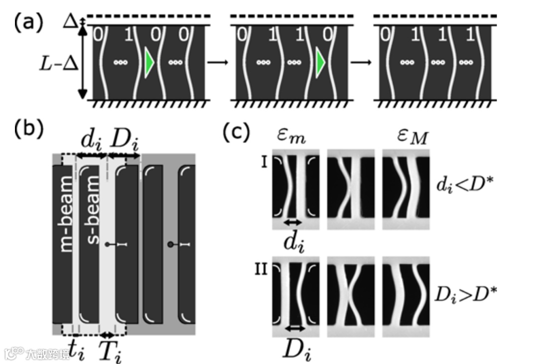 近日,荷兰莱顿大学Lennard J. Kwakernaak团队介绍一种可计算的周期性机械压缩超构材料通用平台。它的单元格有一个记忆梁(m-beam),要么向左弯曲,要么向右弯曲,用二进制值si=0或1来表示它。单元格设计为与其相邻单元格相互作用,在循环压缩下,处于1状态的任何单元格都会将该状态复制到其右侧相邻单元格。这就产生了一个机械时钟波,“1”状态向右移动,每个压缩周期移动一个单元格。因此,集体状态S:={s1, s2, ...}的演变就像细胞自动机一样,反复循环压缩产生简单的可预测路径。此外,它们还提供了一种无障碍、可控的瞬态存储器。通过在聚合超构材料中组合这种梁计数器,实现了对多振幅压缩循环的检测,相当于多个瞬态存储器。最后,异质计数器表现出复杂的记忆效应,瞬态时间取决于驱动幅度,响应则取决于驱动序列。总之,该超构材料为在超构材料中实现有针对性的多步骤途径建立了一个通用平台,并为在材料中实现顺序信息处理开辟了一条途径。相关研究发表在《Physical Review Letters》上。(徐锐)