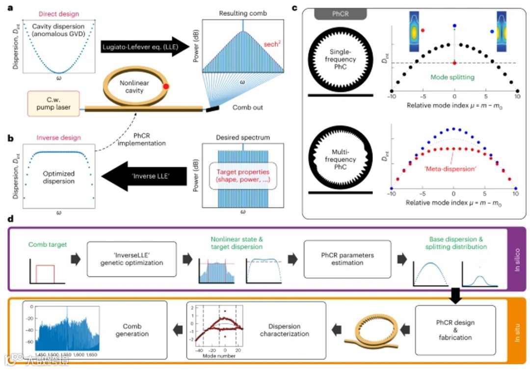 光学微谐振器中的非线性波混频为产生紧凑的光频率微梳提供了新的前景,使越来越多的应用成为可能。微梳的产生通常基于耗散克尔孤子。耗散克尔孤子是通过非线性相移来平衡非线性增益、异常群速度色散和泵浦激光失谐而实现的。以二阶色散为主所得到的耗散克尔孤子脉冲在时域和频域上具有一个平方的正切双曲分布。由于与克尔非线性平衡,谐振器主要是色散决定了所支持的非线性状态的脉冲形状和频谱。在电信等应用中需要定制梳状光谱轮廓,其中每模式的高功率和光谱平坦度可提高数据链路的性能和效率。然而,目前所需的微梳光谱与所需的色散、材料特性或谐振器的几何形状之间没有直接关系。此外,在谐振器中实现精确的色散控制历来是一个巨大的挑战,目前仍缺乏一种经过验证的技术来实现任意色散。数值计算和机器学习的最新进展为系统设计和优化引入了新的方法。与此同时,集成光子学不仅为大型系统的小型化提供了潜力,而且还可以更好地控制光的模式,特别是在光子晶体或拓扑优化元件中,这为实现高度可定制的微谐振器铺平了道路。