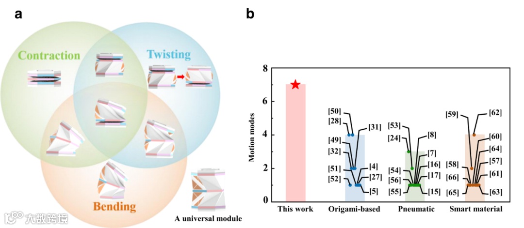 物体的三种基本运动,即弯曲、扭转和收缩/延伸,以及它们之间组合使得自然界生物的运动方式多种多样。实现这些从简单到复杂的运动类型是机器人领域的关键研究方向。在这方面,具有柔顺性和较安全的人机交互能力的软体驱动器展现出了非凡的潜力。现有的大多设计表现为单一运动模式,仅有收缩、弯曲和扭转等运动形式,这限制了它们实现复杂多自由度运动的能力。相关研究人员通过多级联连接这些单一运动模式从而实现复杂的空间运动,但由于每个独立致动器的简单功能导致了单一驱动器的运动轨迹和控制十分复杂。因此,开发出具有多模式的驱动器意义重大。
