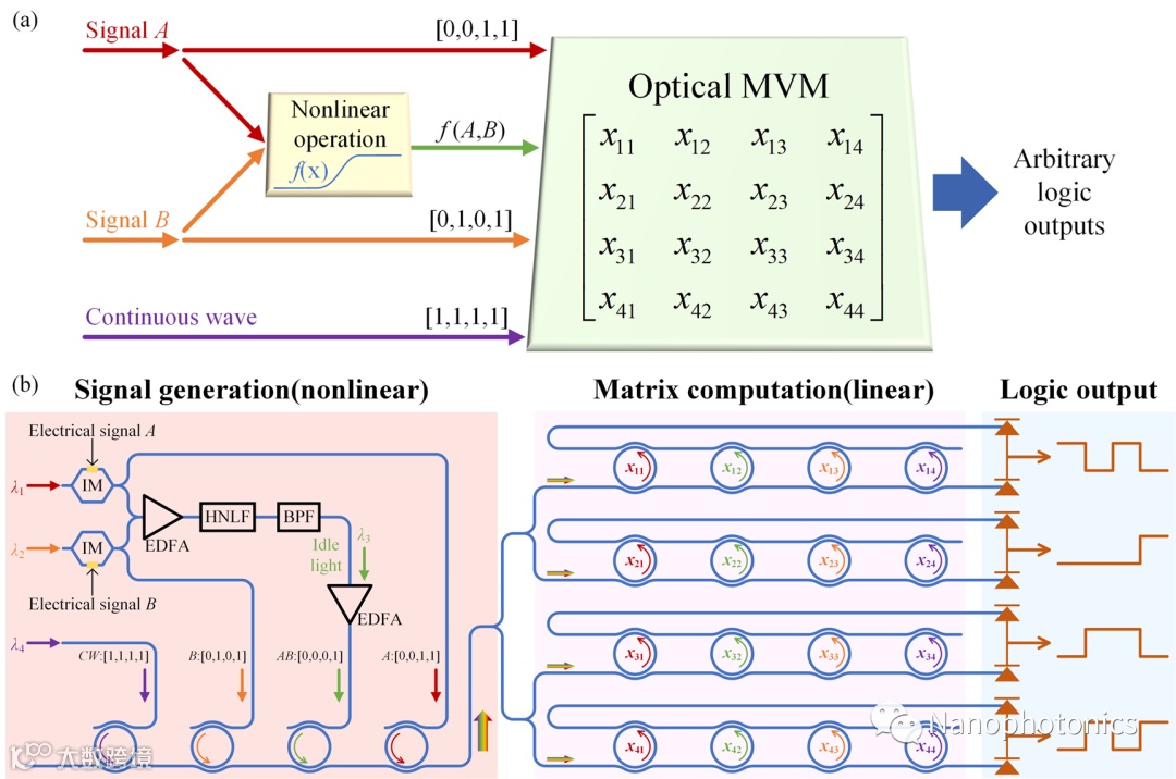 在现有光学计算方案中,光子线性运算种类非常丰富,且易于由光学元件实现。光子矩阵向量乘法,作为一种典型的线性运算,可以通过马赫-曾德尔干涉仪网络、平面光转换器件和微环阵列来实现。并且大量的研究也证明了光子矩阵具有极强可重构性的优势。但当涉及到光子非线性运算,特别是逻辑运算,由于光学非线性方案本身的多样性和可重构性有限,实现精确非线性变换的难度急剧增加。在众多逻辑运算的研究中,可编程逻辑阵列因其灵活性和通用性而显得尤为重要。但是,现有的光学方案往往需要复杂的器件并执行多次非线性运算,这使得光学可编程逻辑阵列的实现尤为困难。如果能将光子线性计算的可编程能力和多样性运用于光学非线性计算当中,那么将极大简化对于特定光学非线性运算的精确实现(如布尔逻辑运算)。