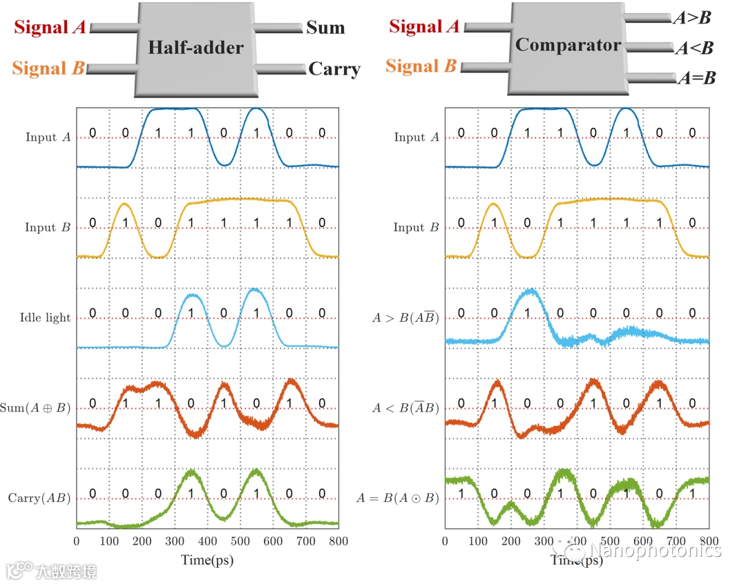 具体实验中,研究人员利用高非线性光纤中的四波混频效应实现信号A与信号B的光学非线性效应,利用微环阵列实现高维线性变换(图2),进而实现目标逻辑功能输出。由于微环阵列具有多个输出端口,研究人员实现了如比较器和半加器这类的组合逻辑功能,并展示了10Gbit/s的高速逻辑运算结果(图3)。