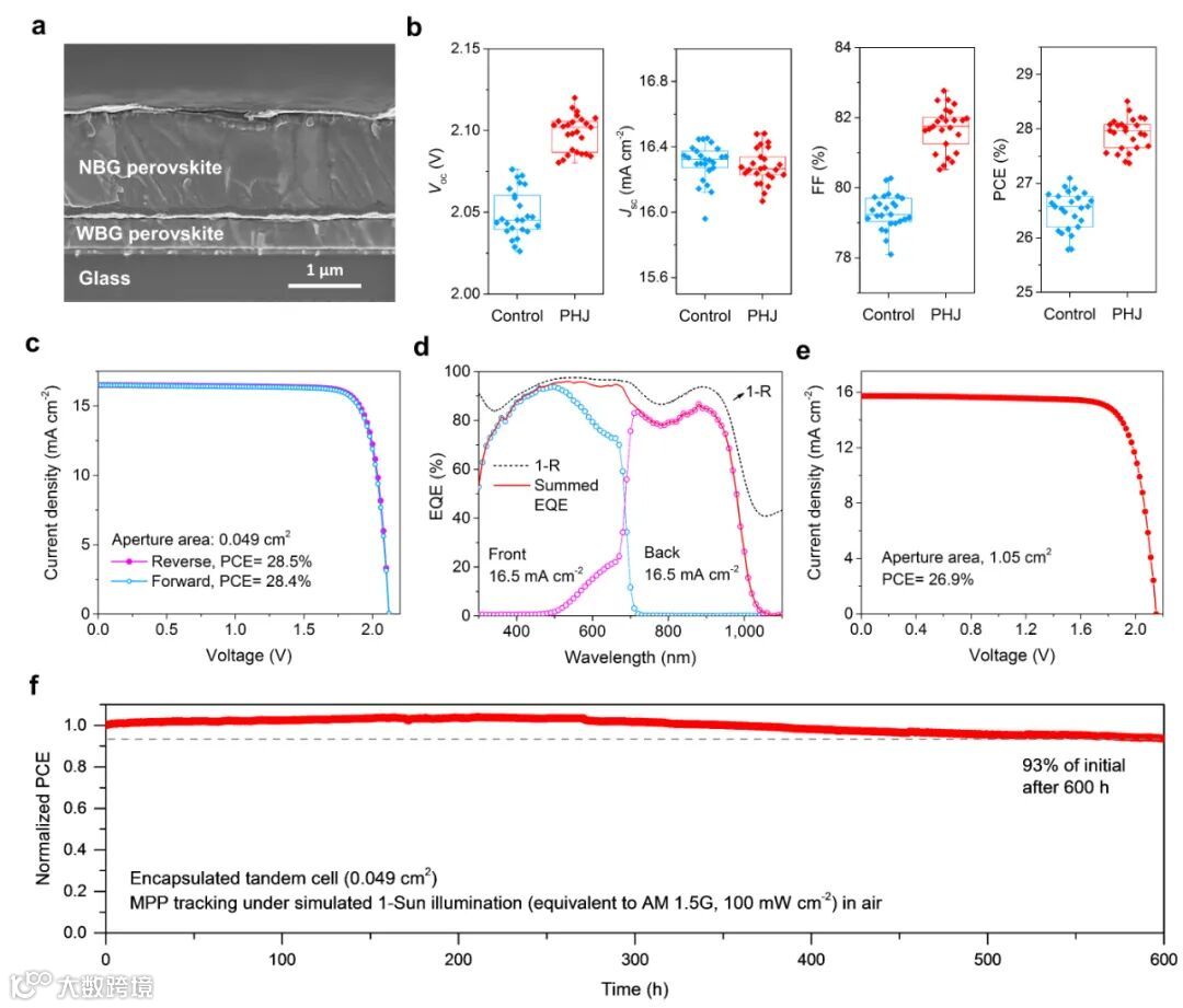 “双碳”目标是我国作出的重大战略决策,发展清洁低成本的太阳能光伏发电,是实现这一战略目标的重要途径与技术保障。通过串联宽/窄带隙钙钛矿子电池构筑的全钙钛矿叠层太阳能电池,兼备高效率和低成本等优点,是下一代光伏技术的重要发展方向。南京大学谭海仁教授课题组长期从事新型太阳能电池的研究,致力于将国家能源重大需求与基础应用研究相结合;近年来,团队围绕“全钙钛矿叠层太阳能电池”这一国际前沿科学领域开展了系统深入的研究,研制的钙钛矿叠层电池世界纪录效率连续6次被国际权威的《Solar cell efficiency tables》收录。近期,团队在全钙钛矿叠层电池领域取得最新进展,经日本电气安全和环境技术实验室(JET)国际权威认证的转换效率高达28.0%,首次超越了传统晶硅电池,该结果被收录到最新一期《Solar cell efficiency tables》(Version 61)。2023年6月8日,相关研究成果《All-perovskite tandem solar cells with 3D/3D bilayer perovskite heterojunction》以快速预览形式在线发表于《Nature》主刊(https://www.nature.com/articles/s41586-023-06278-z)。匿名审稿专家对这项工作高度评价 — “本文在这个领域展示了非常有意义的结果,因为它不仅展示了世界最佳性能的全钙钛矿叠层太阳能电池,而且还提出了与现有缺陷钝化方法不同的3D/3D异质结” (This paper shows a very meaningful result in this field in that it not only shows excellent photovoltaic performance on the world-best all-perovskite tandem but also presents the 3D/3D heterojunction as a way unlike existing approaches with defect passivation)。这也是谭海仁团队近两年来发表的第三篇顶刊。宽带隙钙钛矿顶电池、窄带隙钙钛矿底电池和隧穿结是构建全钙钛矿叠层电池的三个核心部分,开发高性能隧穿结和高效率窄带隙子电池则是实现高效叠层电池制备的关键核心点。谭海仁团队前期在新型隧穿结结构设计【见Nature Energy, 2019, 4, 864-873】、窄带隙钙钛矿结晶生长调控【见Nature Energy, 2020, 5, 870-880】、晶粒表面缺陷钝化【见Nature, 2022, 603, 73-78】以及大面积叠层光伏组件的可量产化制备技术【见Science, 376, 762-767】等方面开展了系统性研究,实现了认证效率达26.4%的全钙钛矿叠层电池和认证效率21.7%的大面积叠层组件,成果入选科技部评选的2022年度“中国科学十大进展”。目前全钙钛矿叠层电池的效率主要受限于较小的开路电压和填充因子,其中窄带隙钙钛矿子电池在保持高短路电流密度下无法同时实现高的开路电压和高的填充因子,是限制全钙钛矿叠层电池效率的主要原因。铅-锡混合窄带隙钙钛矿薄膜表面存在较高的缺陷态密度,这一高缺陷态密度的界面层(defective interface layer, DIL)与电子传输层造成了严重的界面非辐射复合损失,限制了全钙钛矿叠层电池的光伏性能。在钙钛矿薄膜上通过溶液法表面后处理构造一层二维(2D)钙钛矿,形成2D/3D异质结结构,是降低钙钛矿电池界面复合损失的一种常见策略。然而,溶液法表面后处理得到的2D钙钛矿均一性较差(层数n值难以控制)且导电性较低,不利于载流子的界面输运和抽取,限制了器件的光伏性能。为解决上述瓶颈,本研究设计了新型的3D/3D双层钙钛矿异质结(PHJ)结构:利用真空蒸发和溶液加工混合法,在铅-锡混合窄带隙钙钛矿薄膜上生长一层数十纳米厚的三维纯铅宽带隙钙钛矿薄膜(FL-WBG)(见图1 a-c)。通过调控三维纯铅宽带隙钙钛矿的组分,使其与窄带隙钙钛矿形成Type-II型异质结结构,促进载流子(电子)从钙钛矿吸光层向电子传输层抽取,降低钙钛矿/电子传输层C60之间的界面复合损失,显著提升了电池的开路电压、填充因子和光电转换效率(图1 d),最佳性能的窄带隙钙钛矿电池光电转换效率达到了23.8%(图1 e),为目前报道的最高效率。图1. 3D/3D双层钙钛矿异质结结构及窄带隙钙钛矿电池光伏性能。a,含有3D/3D双层钙钛矿异质结(PHJ)的窄带隙钙钛矿电池器件结构。b, 3D/3D双层钙钛矿异质结的截面HR-STEM图和相应的EDX图。c, PHJ钙钛矿薄膜的飞行时间二次离子质谱图。d,对照器件(control)和PHJ窄带隙钙钛矿电池的光伏性能统计图。e, 最佳性能PHJ钙钛矿电池的J-V曲线。使用紫外光电子能谱(UPS)测量的不同钙钛矿的能级显示:精细调控的FL-WBG钙钛矿与铅锡钙钛矿形成Type-II型能带异质结结构(见图 2a-c)。经过费米能级平衡和能带弯曲后,具有PHJ结构的铅锡钙钛矿能带向下弯曲,这驱使空穴能够远离(见图2 c 蓝线)铅锡钙钛矿表面的缺陷层(DIL),并加速电子向电子传输层(C60)的漂移 (见图2c 红线),从而减少了载流子在缺陷层处的非辐射复合(见图2 b 红线和蓝线)。为了进一步探究PHJ层对铅锡钙钛矿性能的影响,本研究通过1D-SCAPS模拟了表面缺陷层在不同缺陷态密度和不同厚度下的光伏性能。模拟结果表明:在表面缺陷层的缺陷态密度和厚度增加时,PHJ铅锡钙钛矿受其影响均远小于对照器件(见图2 d-f)。这表明,PHJ结构带来的场钝化效应减少了钙钛矿与电子传输层的接触损失,从而有效地屏蔽了表面缺陷层对铅锡窄带隙钙钛矿太阳电池性能的影响。图2. 有/无PHJ的铅锡钙钛矿的能级关系图和模拟的光伏性能。a, PHJ 铅锡钙钛矿太阳能电池各功能层的能级排列。b-c,能带弯曲后的Control和PHJ铅锡钙钛矿太阳能电池的能级图;红线和蓝线分别表示非辐射复合路径和载流子漂移方向。d-e, 1D-SCAPS电学模拟:在具有不同缺陷密度(d)和厚度(e)的缺陷层下,Control和PHJ铅锡