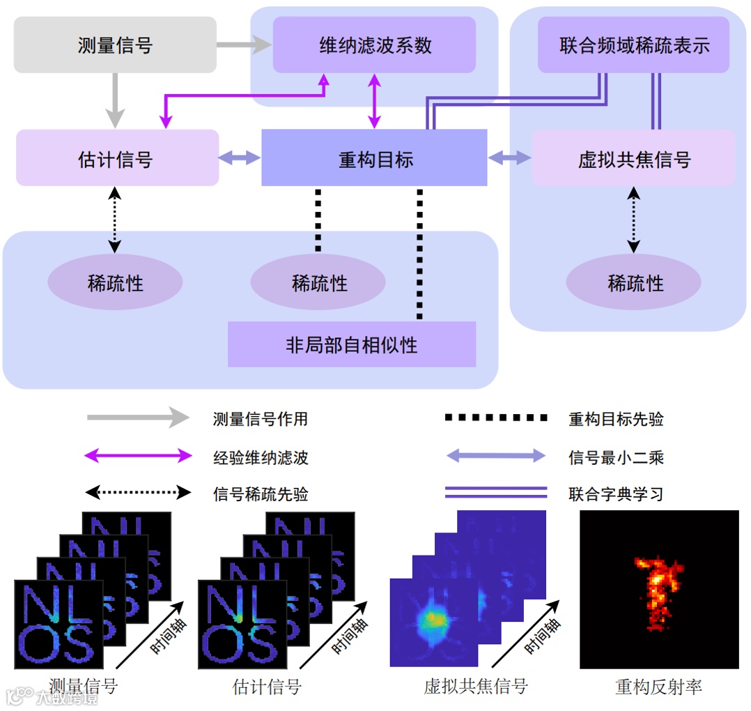针对以上难题,研究团队提出了CC-SOCR重建方法,一举突破了传统非视域成像的场景范式,对于任意中介面形态(如图1b-1e所示的栅栏、百叶窗、窗框、异形结构等)均可实现准确成像。CC-SOCR方法基于贝叶斯推断,创造性地引入了虚拟共焦信号,并能够同时获取测量点处的低噪音估计信号、虚拟共焦信号及非视域目标的反射率与法向信息。同时,该方法发展和融合了稀疏优化、非局部自相似先验、双向正交字典学习、经验维纳滤波及联合频域稀疏表示等技术,具有优异的模型可解释性。图2展示了新方法的框架图及雕像实例的重构结果。其中,测量点限定于中介面上N、L、O、S字母内部区域。