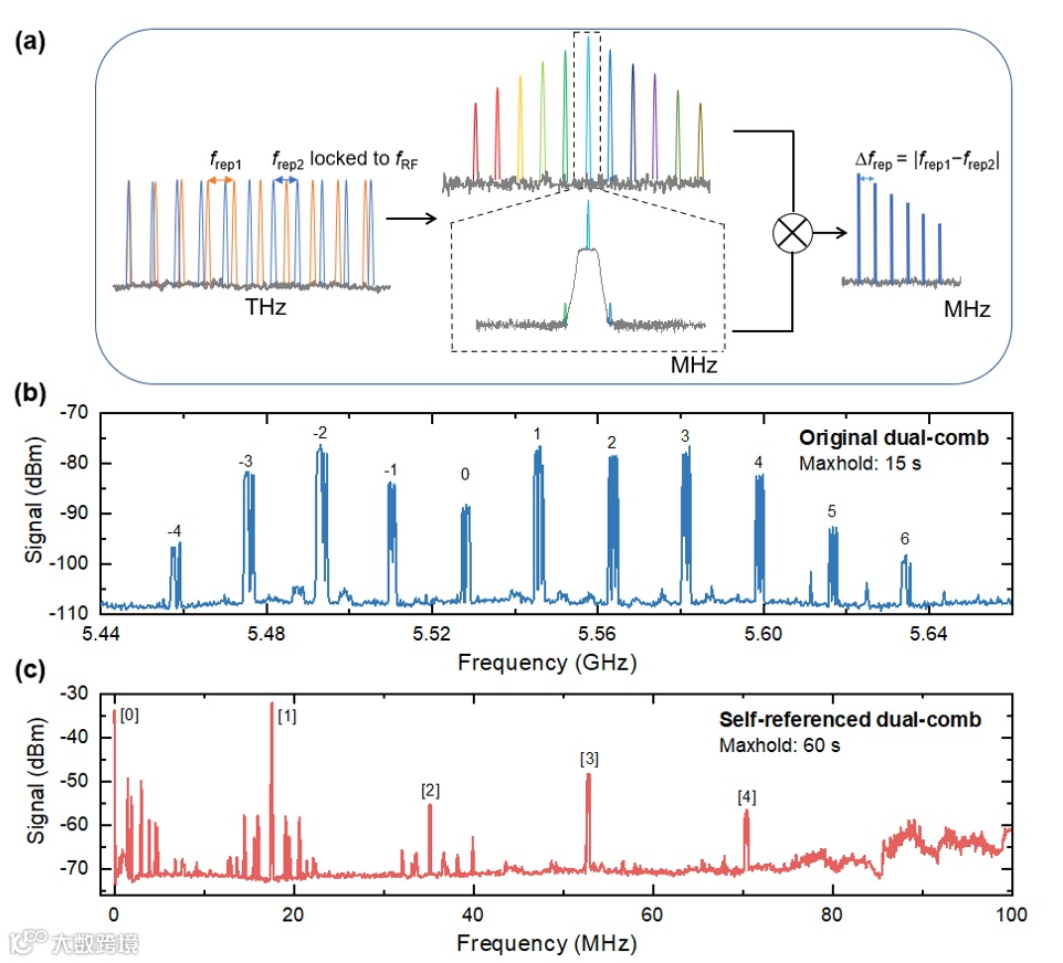 图1(a)自参考稳频原理。其中frep1和frep2分别是两个光频梳的重复频率,其中frep2通过微波注入锁定到fRF。“彩虹”频谱表示MHz范围内的下转换双光梳信号,通过带通滤波器将其中一根梳齿滤出(虚线框),从而采用混频实现零偏自参考双光梳。(b)未稳频THz双光梳“最大保持”频谱,测量时间为15 s。(c)自参考双光梳“最大保持”频谱,测量时间为60 s。