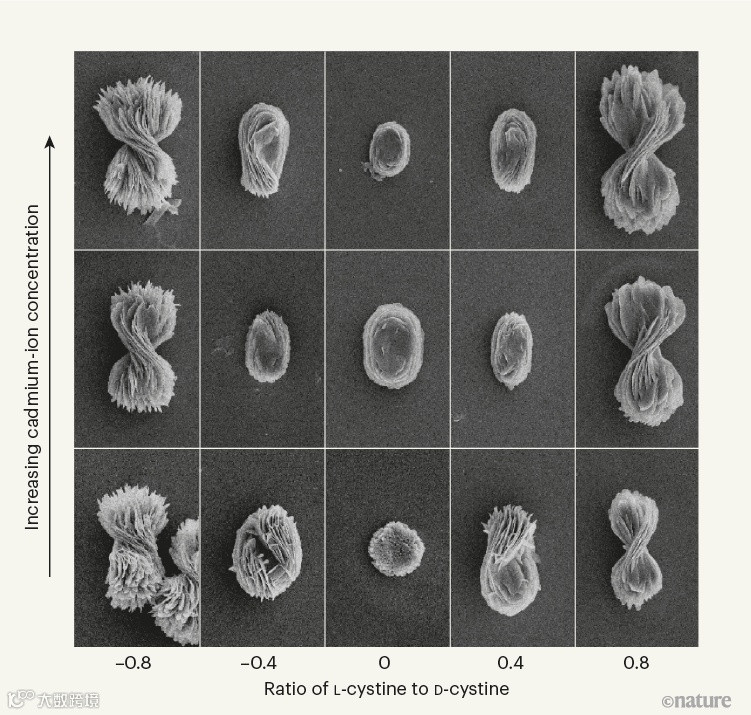 半胱氨酸二聚体的一种形式,被称为L-胱氨酸,在自然界中很丰富,它的镉复合物会以一种方式扭曲,而它的镜像,被称为D-胱氨酸,会以相反的扭曲形成领结。