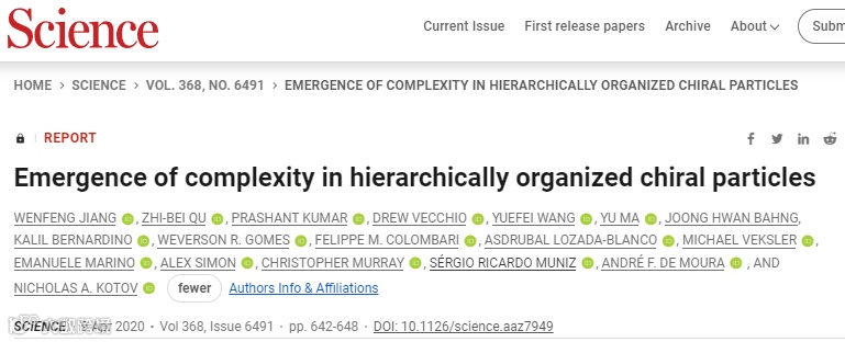 等人合作,在顶级学术期刊《Science》上以“First Release”形式发表了题为“Emergence of complexity in hierarchically organized chiral particles”的最新研究成果。