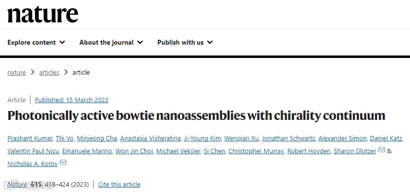 在线发表了题为“Photonically active bowtie nanoassemblies with chirality continuum”的最新论文,详细介绍了Nicholas Kotov教授在