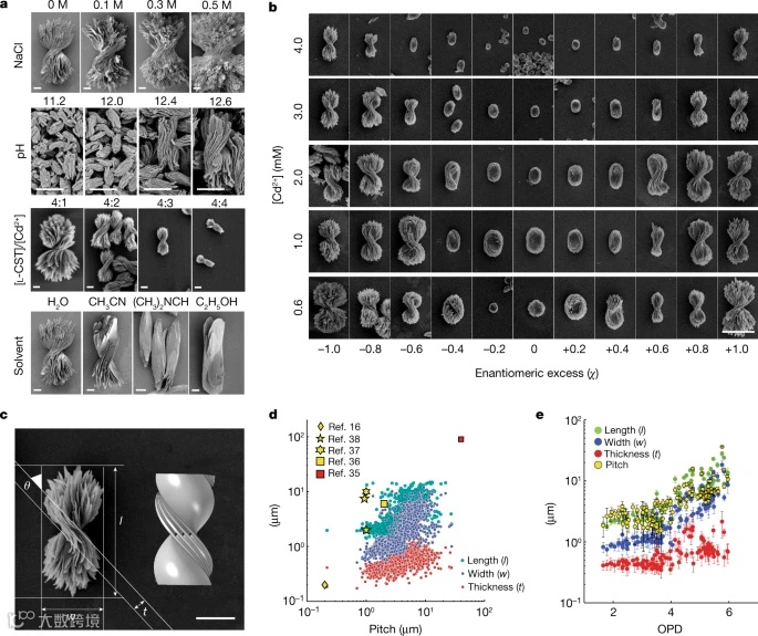 片状的长宽比和线圈的周期性(其间距)都取决于生长条件。螺距也可以通过改变镜像胱氨酸分子的比例来调整