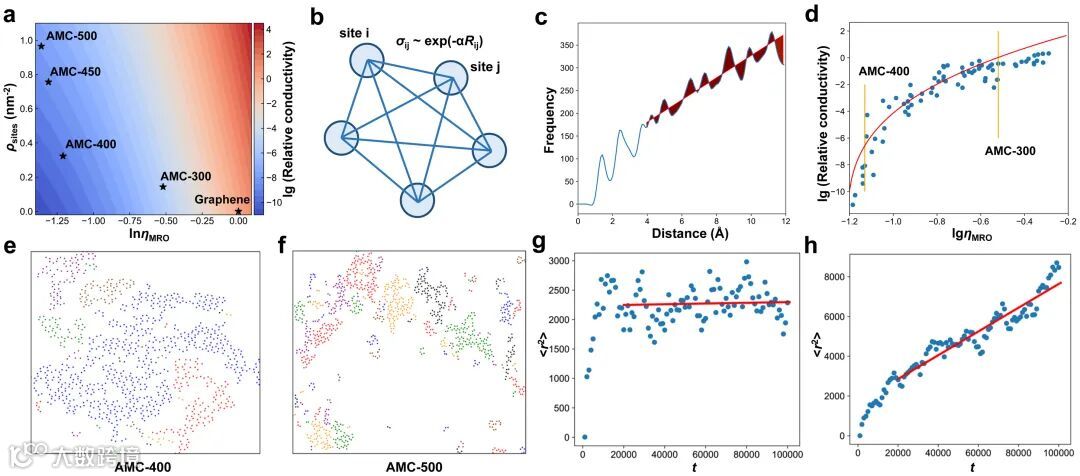 研究人员利用密度泛函理论计算和蒙特卡洛计算成功关联了二维非晶碳的原子结构和电学性质,揭示了AMC导电性差异的微观机理:AMC-300与AMC-400导电性差异的主要来源是中程序的有无;AMC-400和AMC-500的中程序差异不大,其导电性的差异则主要源于纳米晶区域的密度。为此,研究人员引入了一个新的结构序参量—跳跃岛密度;结合中程序,成功绘制了“微观结构-宏观导电性能”相图。这一发现也表明了非晶材料无序度的复杂性,难以直接用中程序完备描述其构效关系。该工作首次在一个非晶材料实例中实现了精准的构效关系,为二维材料、非晶材料物理及应用等领域提供了全新思路。