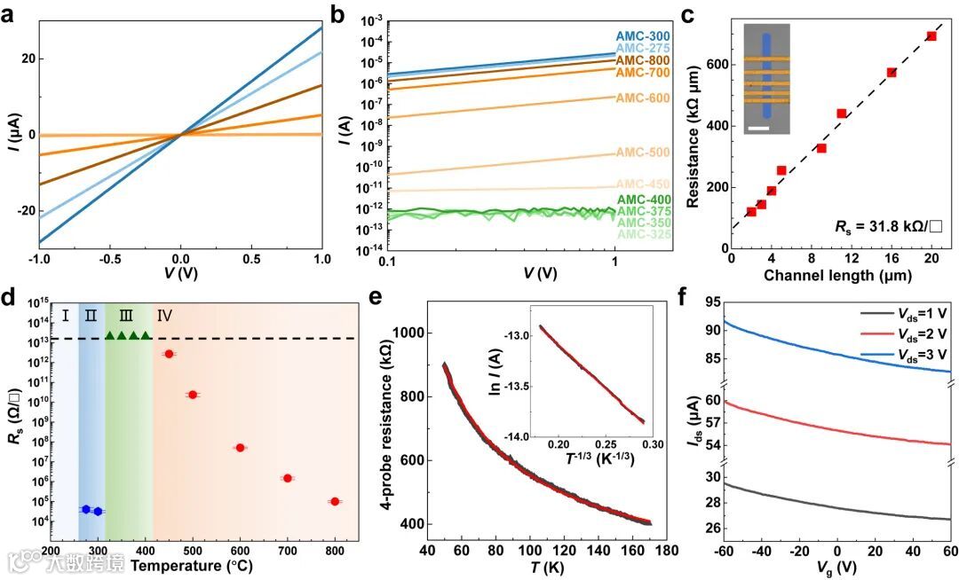 在电学性质的测量中,研究人员发现了AMC材料的高度温度依赖特性:在较低温度下(275-300 ℃)AMC具有微弱的中程序而呈现高导电性(方块电阻Rs: 32 kΩ per square)、325 ℃得到的样品则变为绝缘态、进一步升高温度后,Rs与生长温度负相关。研究人员最终实现了AMC导电性在9个数量级中的连续可调。