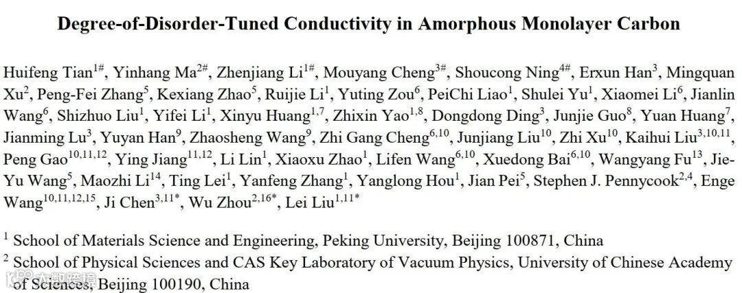 近日,北京大学材料学院刘磊课题组与中国科学院大学周武课题组、北京大学物理学院陈基课题组合作,于2023年3月2日在《自然》期刊发表题为“Disorder-tuned conductivity in amorphous monolayer carbon”的研究论文(DOI: 10.1038/s41586-022-05617-w),首次揭示了二维非晶材料中的构效关系。在该研究中,研究人员利用了“二维材料的原子都暴露在表面,其位置可以被精准解析”这一特性,来解决非晶材料原子结构解析的难题。