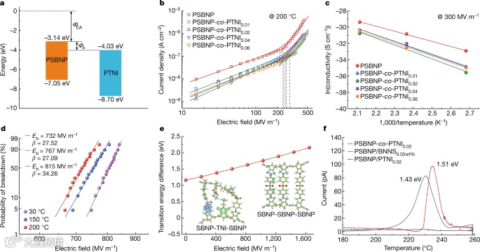 研究人员在能带结构测量中验证了PTNI(4.03 eV)相对于PSBNP(3.14 eV)的更高电子亲和力(图2a)。这表明PTNI很容易捕获注入和激发的电子,并且还建立了深陷阱能级以防止被捕获的电子逃逸。图2b显示了在200℃时,具有不同PTNI含量的共聚物的漏电流密度对施加场的依赖性。值得一提是,在PSBNP有序阵列中引入2 mol%的PTNI分子,共聚物PSBNP-co-PTNI0.02表现出最优的电气绝缘性和最高的电击穿强度,其电阻率比现有介电聚合物高一个数量级以上(图2c)。作者进一步通过DFT理论模拟验证了:电子是困在SBNP-TNI-SBNP单元中,与能带结构分析一致。此外,与SBNP-SBNP-SBNP相比,SBNP-TNI-SBNP中的电子跃迁能量对施加的电场更敏感。TSDC测量表明,PSBNP-co-PTNI具有载流子陷阱位点,其能级在238℃下估计约为1.51 eV,甚至高于 PSBNP/氮化硼纳米片(BNNS)复合材料(1.43 eV)。