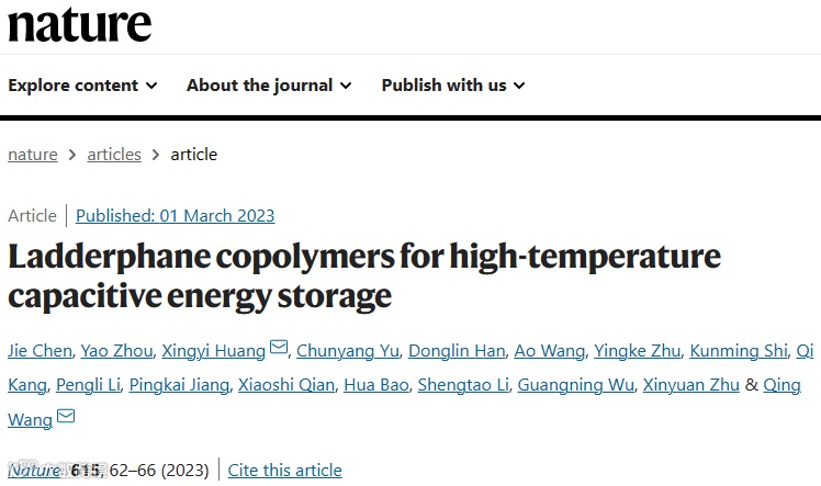 鉴于此,上海交通大学黄兴溢教授团队联合美国宾夕法尼亚州立大学王庆教授团队在聚合物电工绝缘材料研究领域取得重大突破,设计了一类阶梯状共聚物,该共聚物通过π-π堆叠作用自组装成高度有序阵列。在大幅提升柔性聚合物电介质薄膜导热性能的基础上使电阻率提升了一个数量级,解决了导热和绝缘的矛盾。聚合物电介质薄膜厚度方向的本征导热系数为1.96±0.06 W/(mK),是目前报道的绝缘聚合物本征导热系数的最高值。聚合物电介质薄膜在200℃、90%效率下的放电能量密度为5.34 J/cm3,在50000次充-放电循环后储能性依然稳定,且具有良好击穿自愈性,在电磁能装备、新能源汽车、电力电子等领域极具应用前景。相关研究成果以题为“Ladderphane copolymers for high-temperature capacitive energy storage”发表在最新一期《Nature》期刊上。其中,黄兴溢教授和王庆教授为通讯作者,陈杰助理研究员、周垚博士和黄兴溢教授为共同第一作者,上海交通大学为论文的第一完成单位。