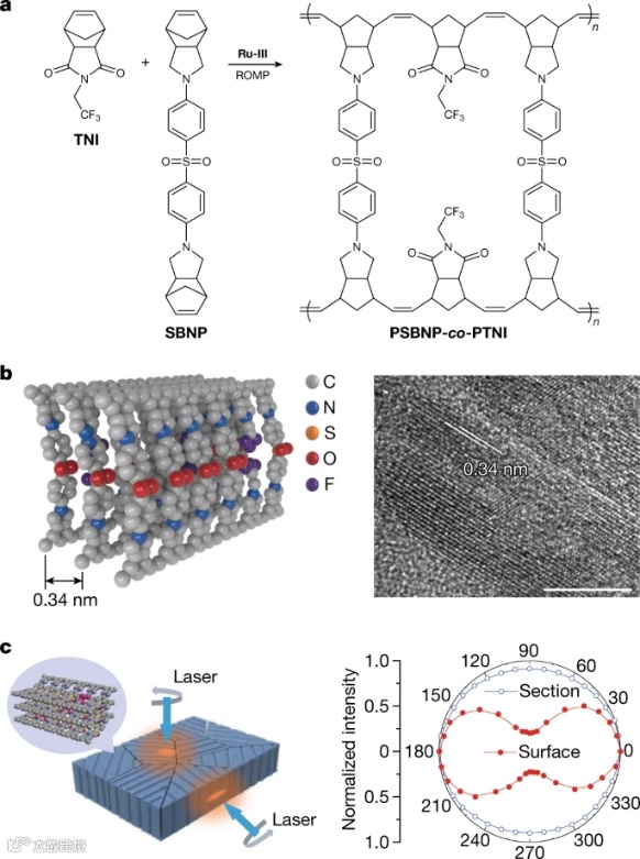 研究人员设计了一种含氟缺陷的双链结构共聚物PSBNP-co-PTNI(图1a)。PSBNP和PSBNP-co-PTNI的高度立构规整构型以及等规链段构象促进链间π-π堆叠相互作用,诱导该共聚物自组装形成高度有序阵列(图1b)。偏振拉曼测试表明(图1c):共聚物薄膜在平面上呈各向同性、在断裂面上呈各向异性,说明有序阵列平行于表面。这造就了电介质薄膜在垂直平面方向表现出1.96±0.06 W/(mK)的高导热系数。
