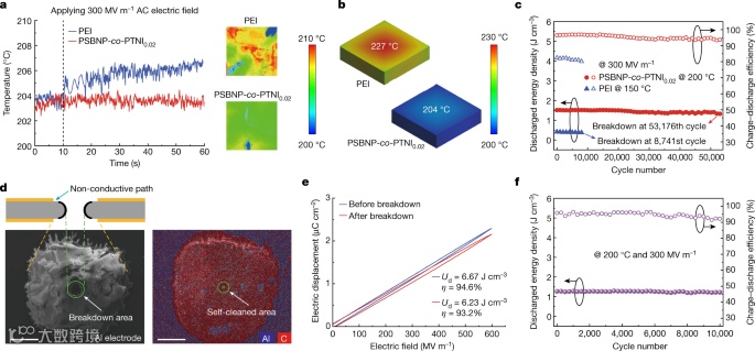作者通过比较PSBNP-co-PTNI0.02和聚醚酰亚胺(PEI,已知最好的商品耐高温聚合物电介质薄膜)的连续充-放电循环过程中的发热现象,发现PEI膜出现了明显的局部热聚集,相反,PSBNP-co-PTNI0.02具有超高的平面导热率,其充-放电循环更加稳定(PSBNP-co-PTNI0.02薄膜连续充-放电循环寿命是PEI薄膜的6倍)。值得一提的是,PSBNP-co-PTNI0.02具有良好的自愈能力,这源于其碳含量较低,因此,在碳化击穿孔和共聚物中的Al电极之间没有形成导电路径。自愈后的储能性没有出现明显劣化,仍能进行10000次的连续充-放电循环。