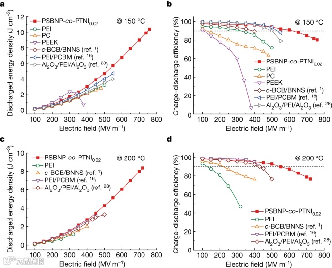 电极化储能测试表明,PSBNP-co-PTNI0.02在150℃和200℃下最大放电能量密度分别为10.42 J/cm3和8.37 J/cm3,90%效率下的放电能量密度分别为6.18 J/cm3和5.34 J/cm3,远优于现有的聚合物及其复合电介质薄膜(图3)。