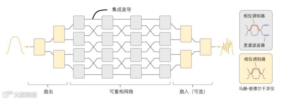 为了突破上述技术瓶颈,本文团队将可重构光子芯片的理念引入到光谱采样整形中,利用可重构光子网络和分布式宽谱滤波技术,突破了芯片级光谱仪的尺寸限制,实现了皮米级超高分辨率。图1展示了所提出器件的概念示意图,其中,可重构网络中每个节点均部署了具备不同滤波特性的宽谱滤波元件,从而为不同的传输通道赋予近乎随机的滤波采样响应。